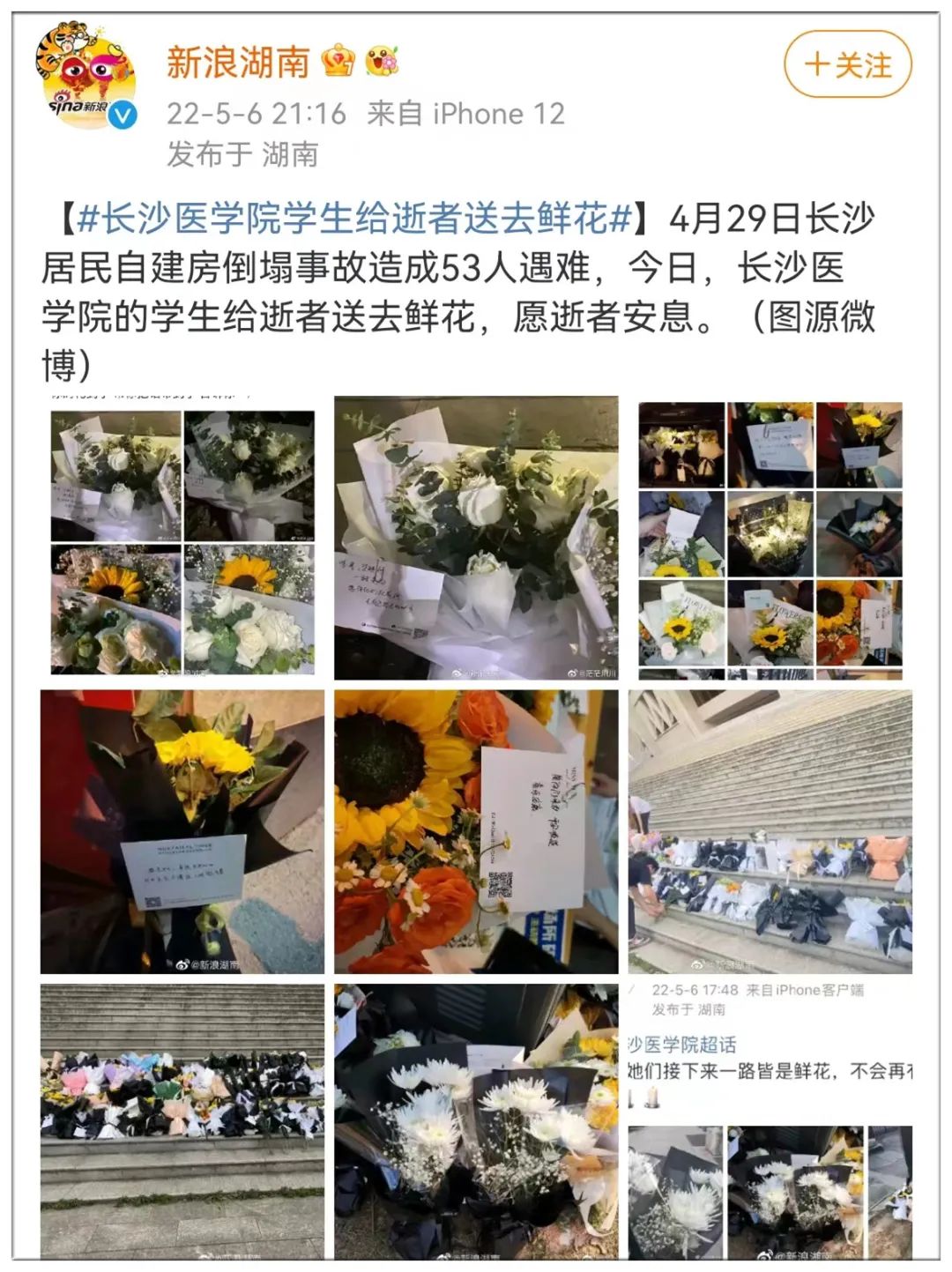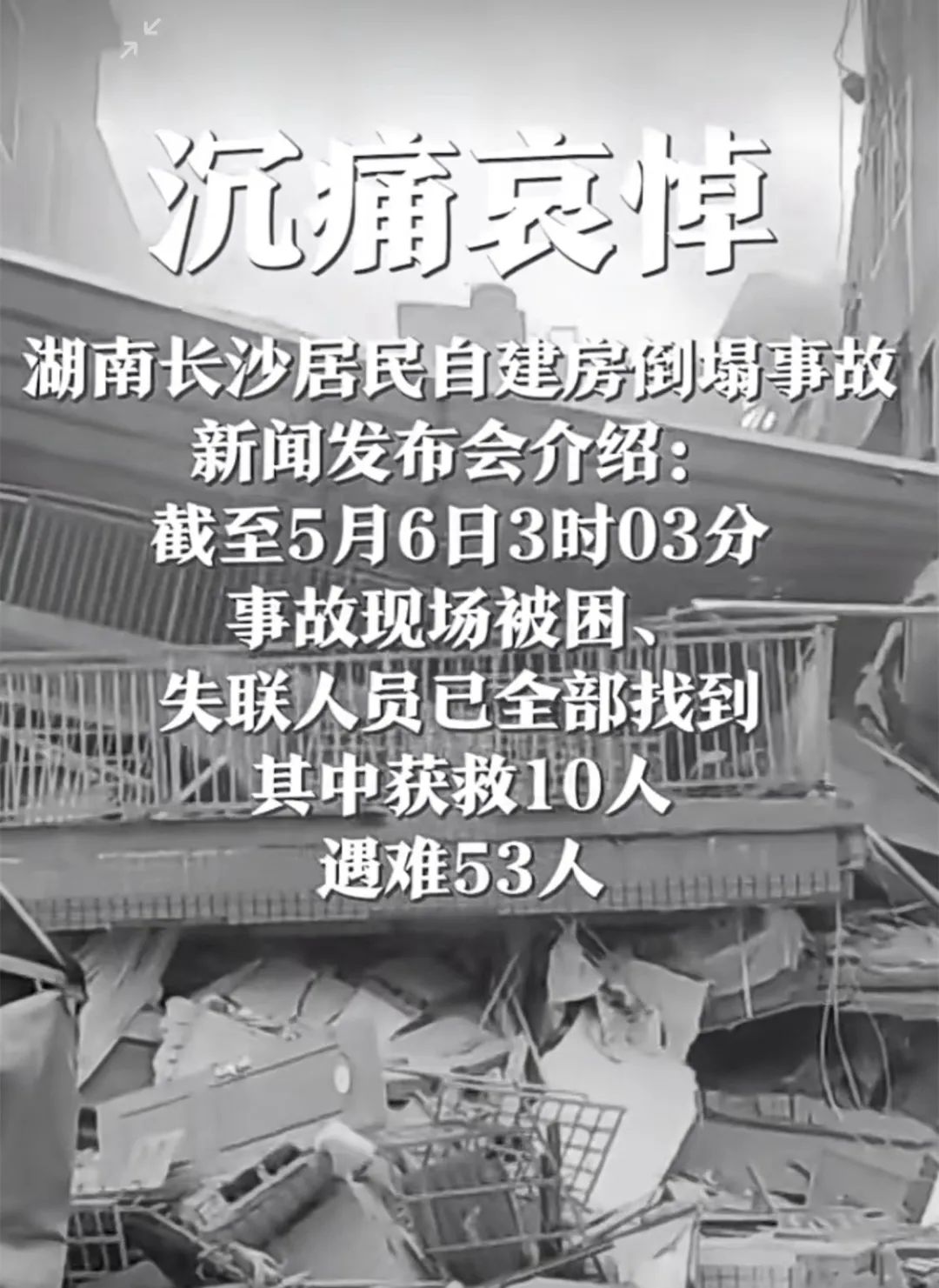 5月6日上午,湖南长沙居民自建房倒塌事故第七次新闻发布会举行。会议通报,经过紧急救援,湖南长沙居民自建房倒塌事故现场救援工作已经结束。事故现场被困、失联人员已全部找到,其中获救10人,遇难53人。心痛如绞,53条生命,53个家庭瞬间毁灭了,想想她们的家人,该有多么的绝望?他们有的是医学生、有的是奶茶店的员工,有的是餐馆的服务员还有送外卖的小哥哥,他们都是努力生活的人,生命却永远定格在4月29日这一天。意外与明天真的不知道哪个先来,无论天灾还是人祸,这对于一个家庭来说,都是一场难以想象的浩劫。让人倍感痛心和惋惜的是,在这些众多的遇难者当中,尚在念书的青年大学生占到多数。这些孩子们都仅仅20岁左右,正当青春茂盛的大好年华,美好的人生还没有展开就因为“突发意外”而匆匆终结,实在太叫人扼腕!